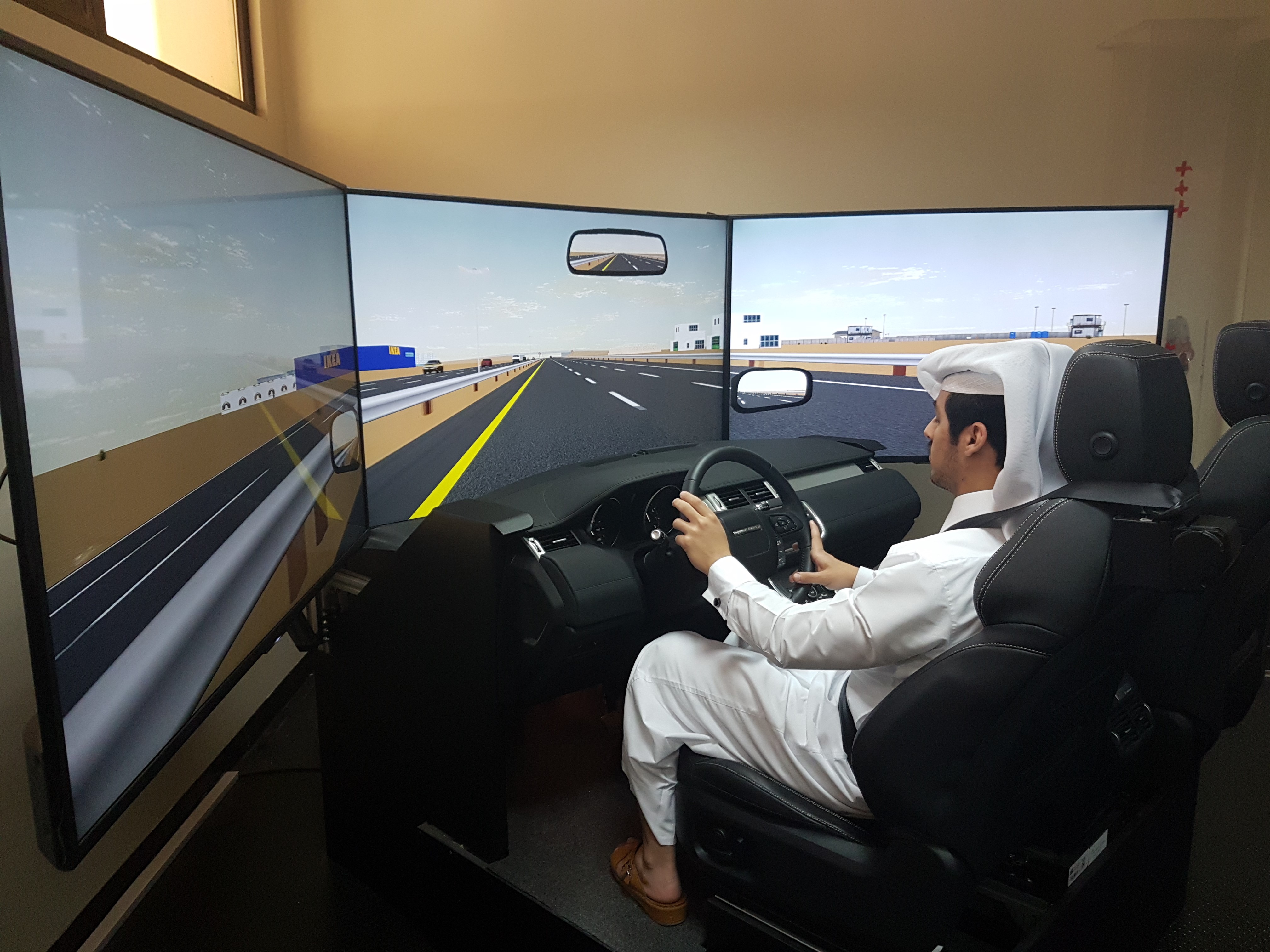 The Qatar Transportation and Traffic Safety Center houses a locally sourced driving simulator in one of its research labs. The driving simulator includes a Land Rover (Range Rover Evoque, 2017) vehicle cab with accurate placement and functionality of controls and displays. It provides a 180° field of view, which allows for realistic peripheral vision. The driving simulator system provides high-speed vehicle dynamics that represents real world vehicle performance and handling characteristics. It is also capable for additional equipment extensions. It runs on STISIM software, which contains an extensive library of roads, intersections, vehicles and other objects.