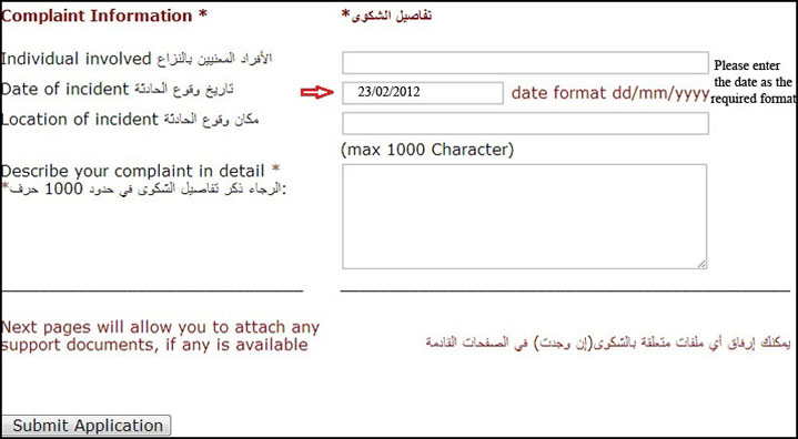 - The page below illustrates the details of the complaint to give you a final opportunity to amend the details, you should tick the term and policies box, as shown, then click Submit Application.